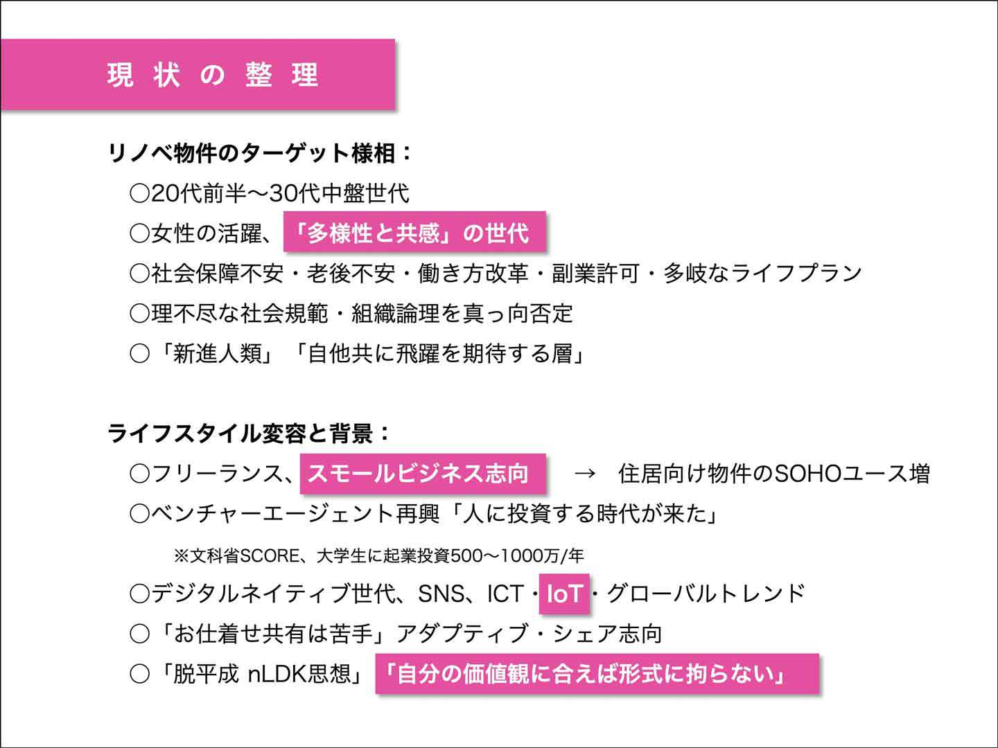 老齢少子・人口減少等による土地建物不動産の価値低下が懸念される中、ライフスタイルの多様化と若年層居住者の生活像に、「ライフスタイル創造」の余地と契機を与える賃貸型集合住宅のプランニングを明示できる点にある。高度情報化社会がもたらした多様な働き方・余暇活動・趣味生活は、既存の集合住宅デザインでは受容しきれない時代に差し掛かっており、そうした市場に対し、以下の観点でリノベーション計画を行うものとする。