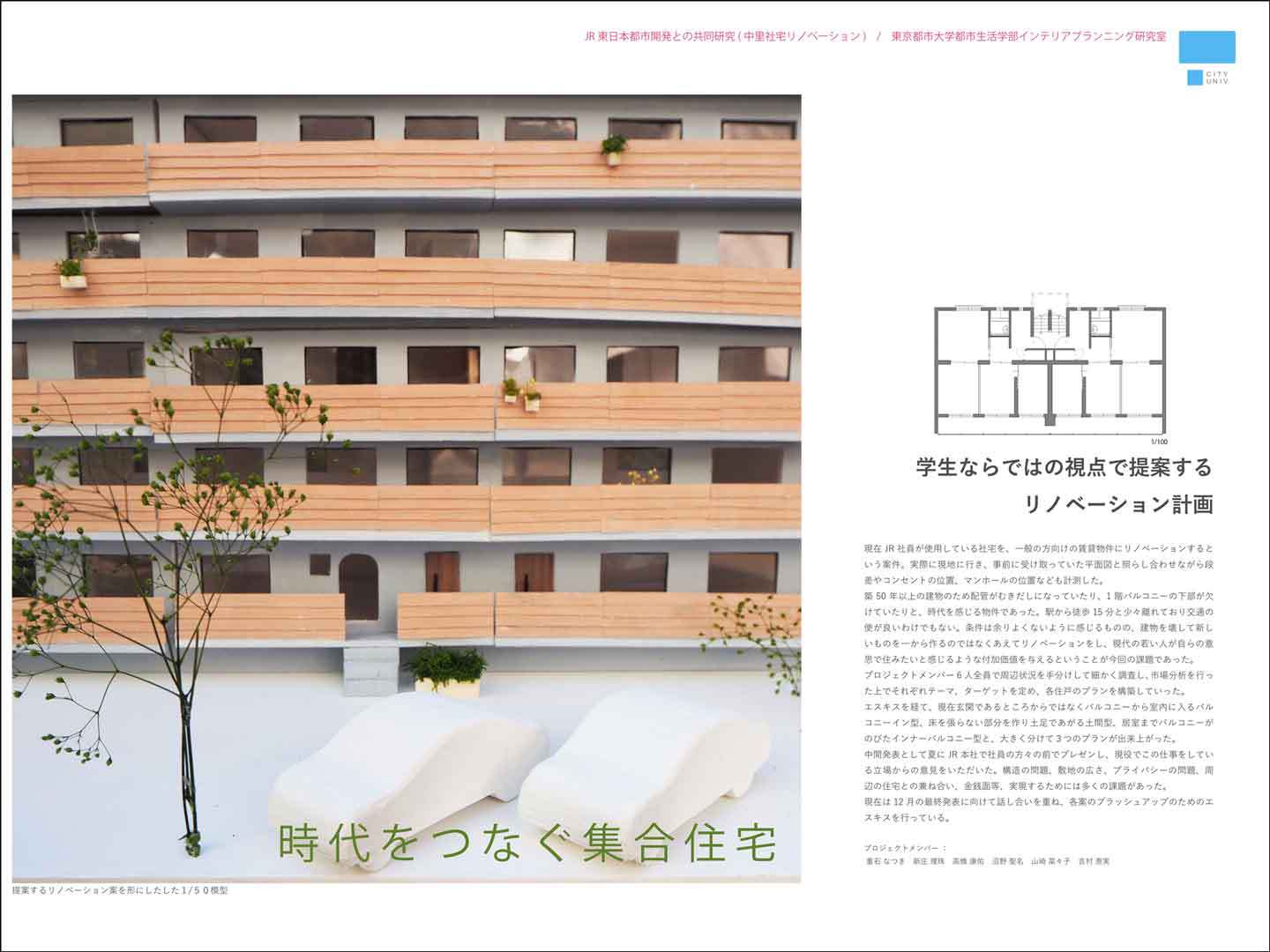 本研究は、㈱ジェイアール東日本都市開発との共同研究であり、老朽化した官舎建物の住戸リノベーションについて、若年層を主たる対象と捉え、鉄道沿線地域のブランディングを足がかりとして、都市近郊型かつライフスタイル創造に寄与する集合住宅のモデル提案および再構築を図ることを目的としている。ひとつのキーワードとして考えられるのは、「シェアハウス」の先を行く「アダプティブ・シェア」。限られた共用部・構造条件のなかで、積極的でない共有空間のシェアを可能にし、メインターゲットの若年層のライフスタイルを支える計画にしていく。なお本研究は目下遂行中につき後日詳細を明らかにする。