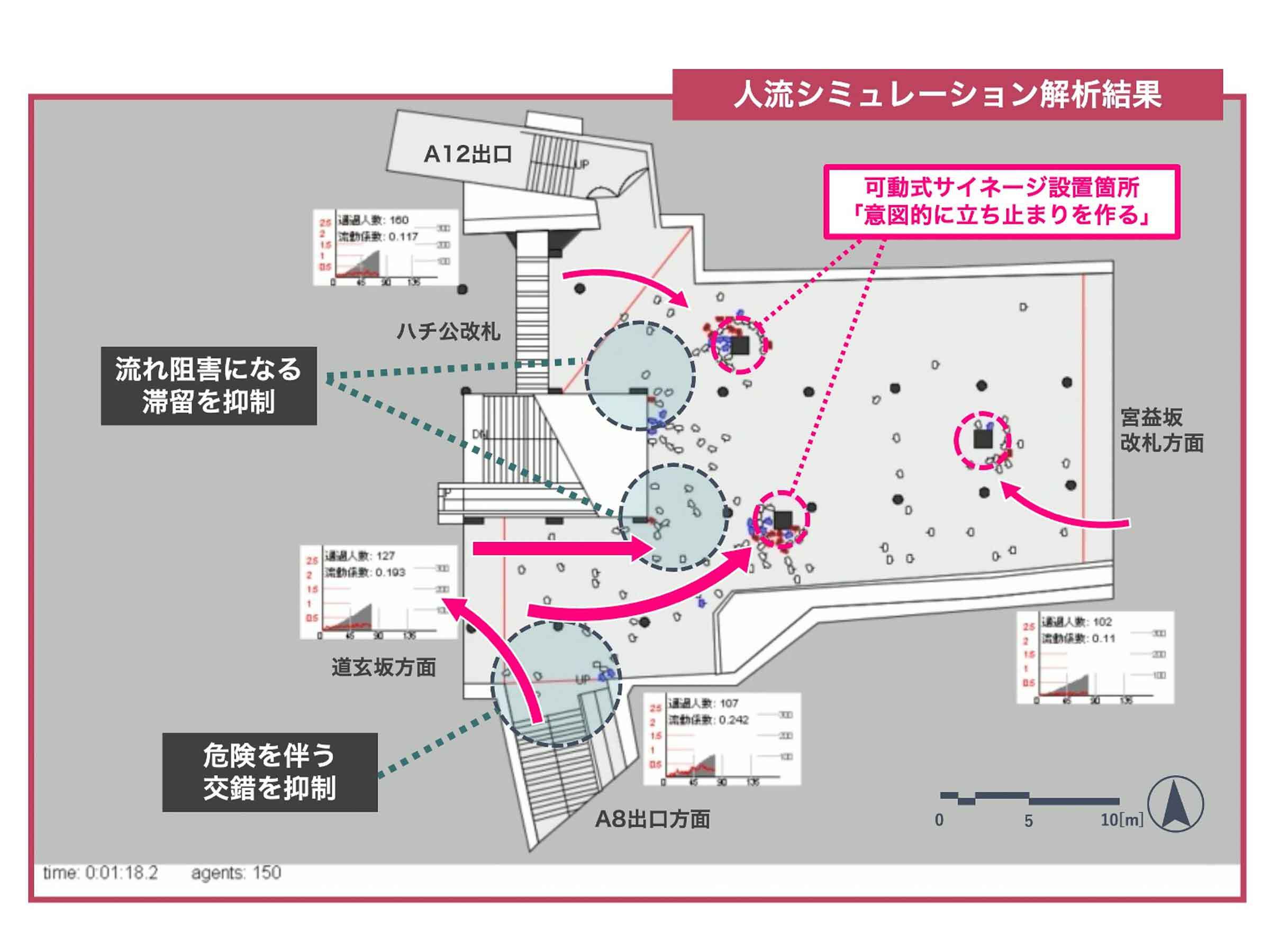 我々東京都市大学都市生活学部 インテリアプランニング研究室は、建築空間・都市整備コンサルティング国内最大手である日本工営株式会社・日本工営都市空間株式会社との共同研究契約をむすび、株式会社東急総合研究所と協働して、首都圏大規模4駅の人流調査データから、慢性的な混雑・交錯・滞留を呈しているゾーンである「混雑負荷が高く人流事故が起こりやすい箇所」を特定し、可動式デジタルサイネージによる情報提示・ナビゲーションにより、人の流れを動的に制御・誘導する方法を、離散系マルチエージェント人流シミュレーションで明示しました。これにより、平常時の歩きにくさの是正のみならず、地震・災害等発生時から復旧時に至る駅構内の混乱を未然に低減させ、質の高い都市交通拠点の整備例を見出しました。