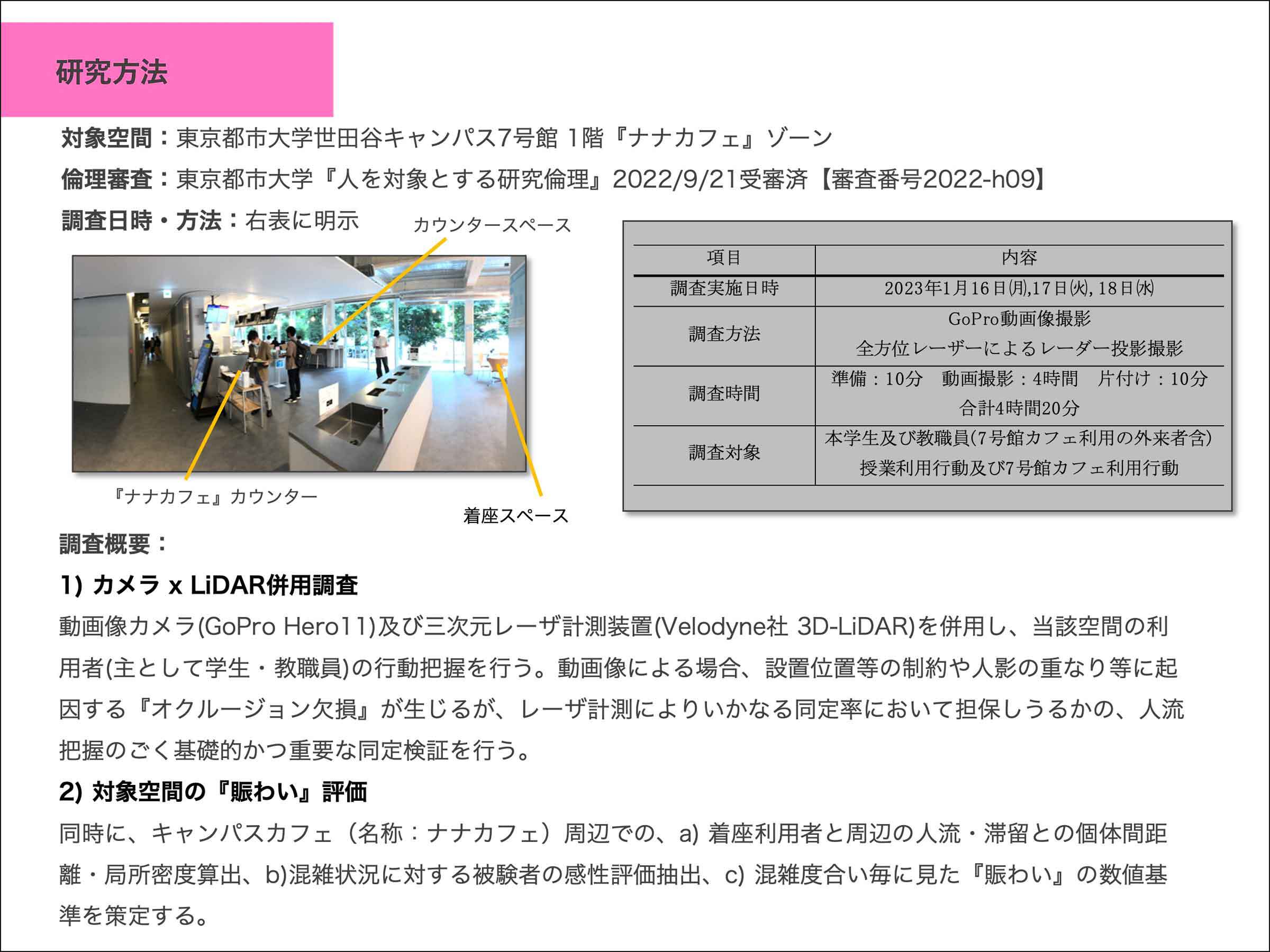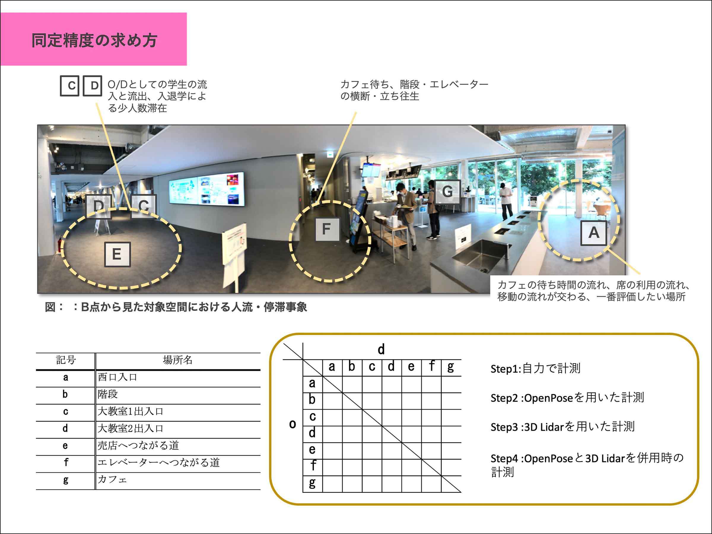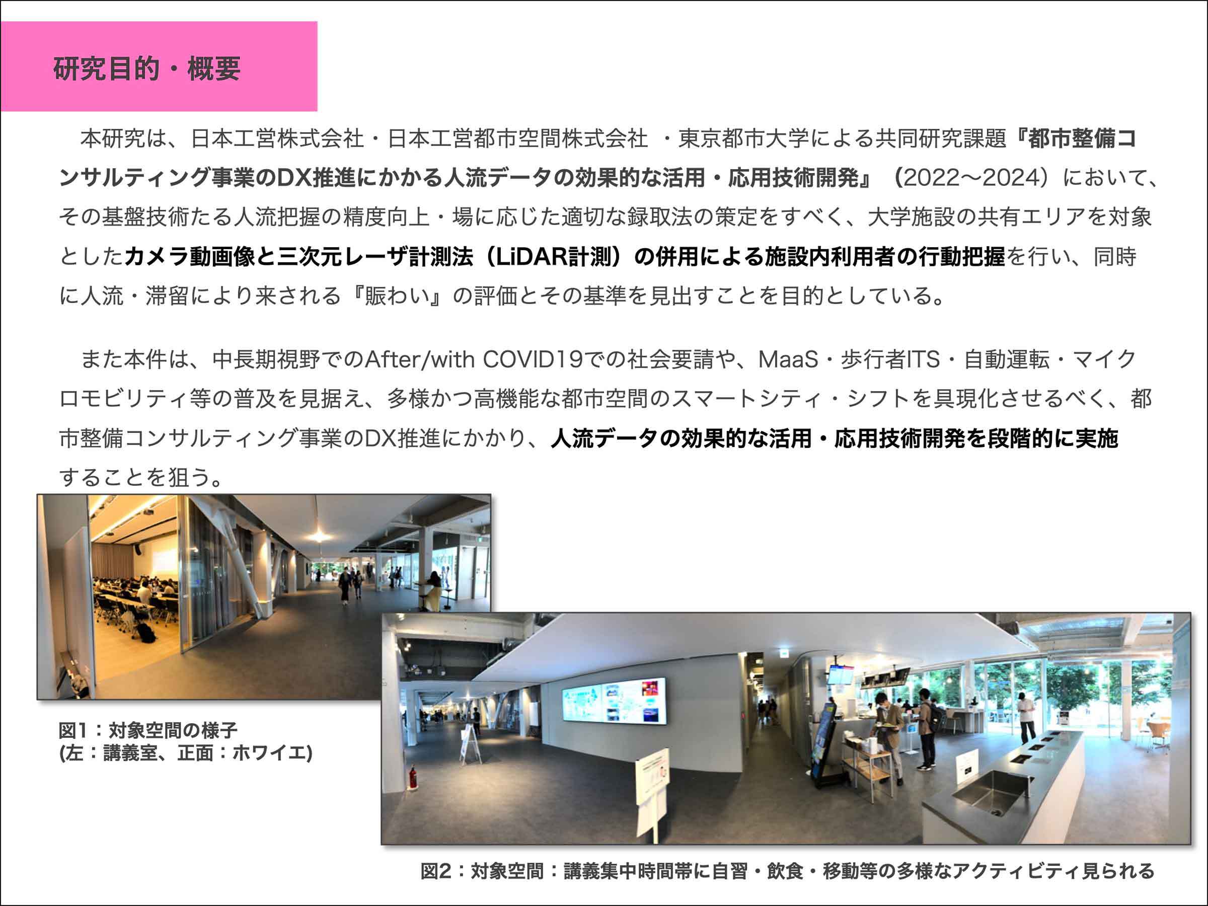 東京都市大学 都市生活学部の高柳 英明教授は、建築空間・都市整備コンサルティング国内最大手である日本工営株式会社・日本工営都市空間株式会社との共同研究のもと、同大学キャンパス内のアメニティ施設(世田谷キャンパス7号館1階 「nana café(ナナカフェ)」)周辺を対象空間とし、カメラ動画像と三次元レーザ計測を併用した利用者の行動把握を実施しました。人流の混雑密度すなわちサービス水準を適用した人流量の同定率を明示すべく、その精度検証を行いました。