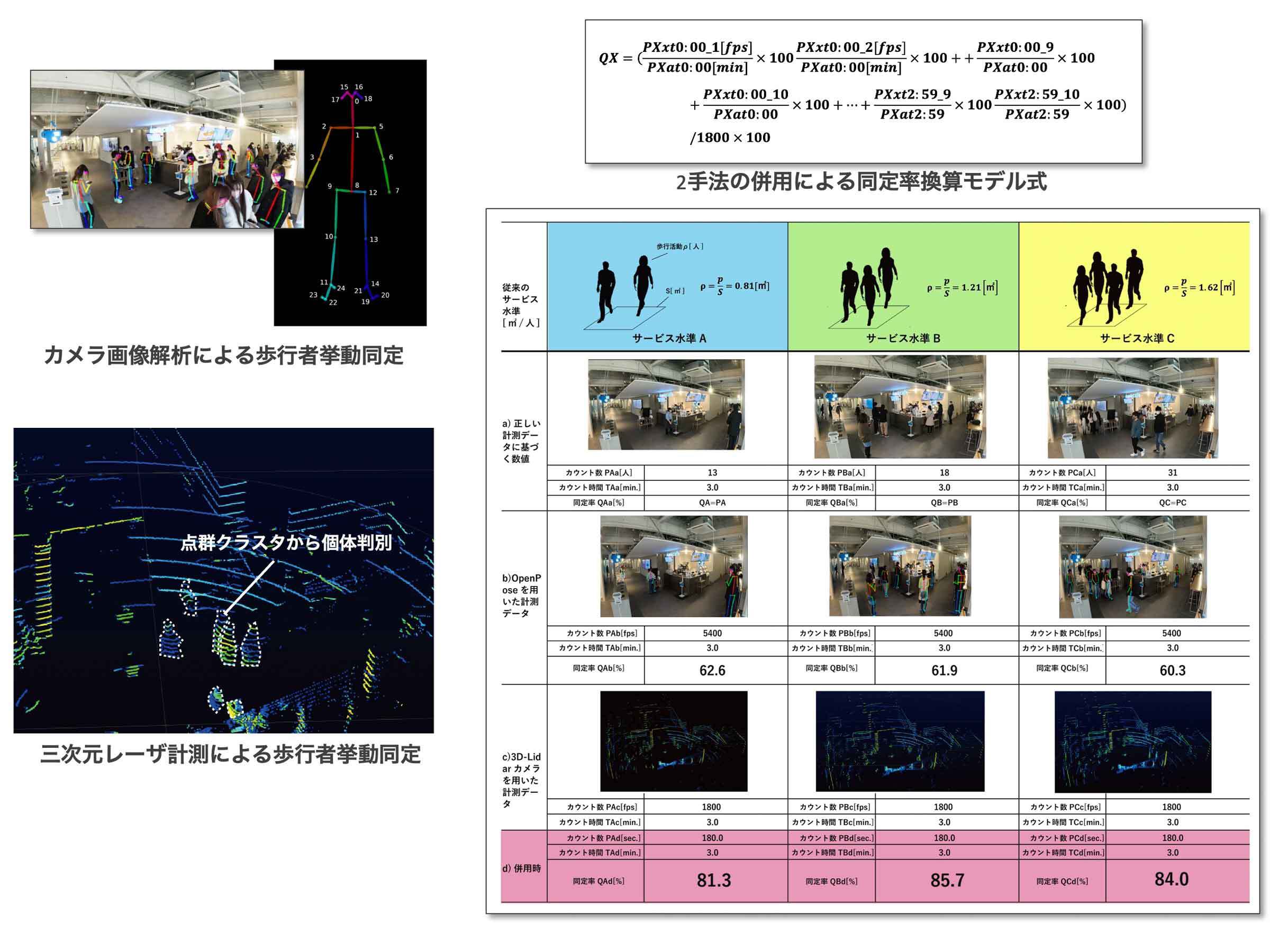 既存のカメラ動画像、あるいは三次元レーザ計測のみの把握では、約65%程度の同定率であったものを、人流の混雑度合いであるサービス水準毎に併用し、正しい把握事象数に対して