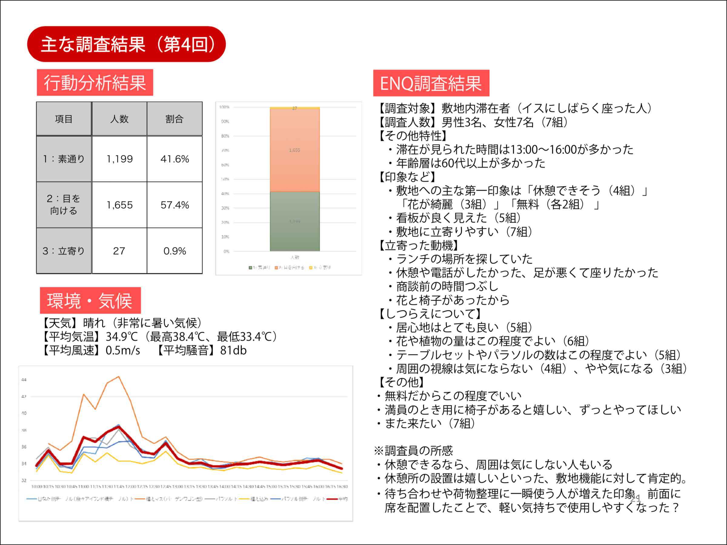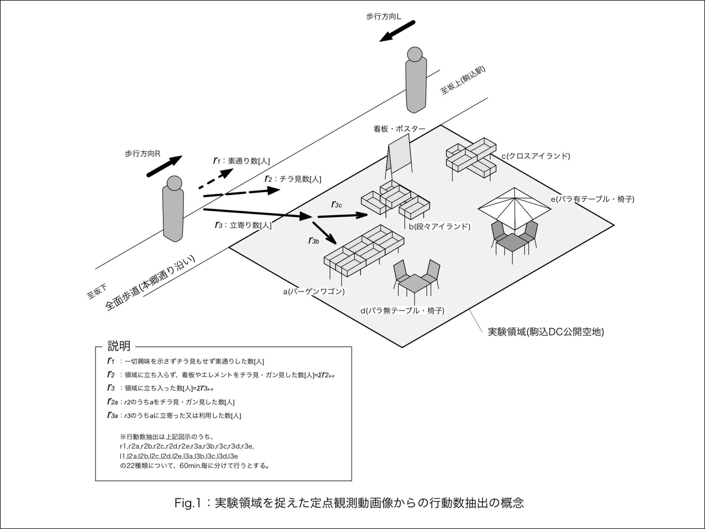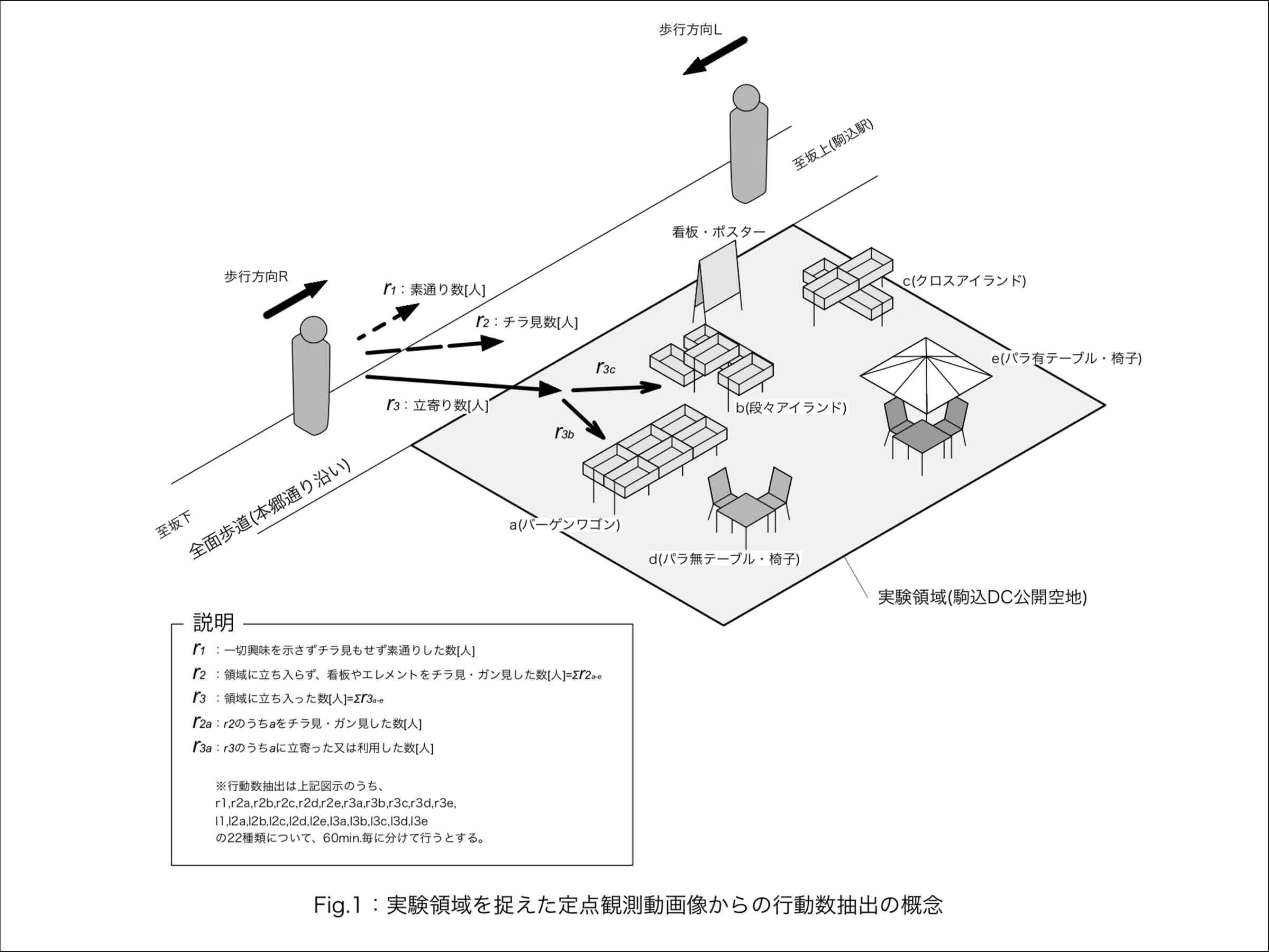 また調査手法としては、定点観測ビデオ映像に基づく利用者行動抽出と、専門調査員による利用者へのヒアリング調査を行った。なお本研究は調査場所を変えて現在も継続中である。