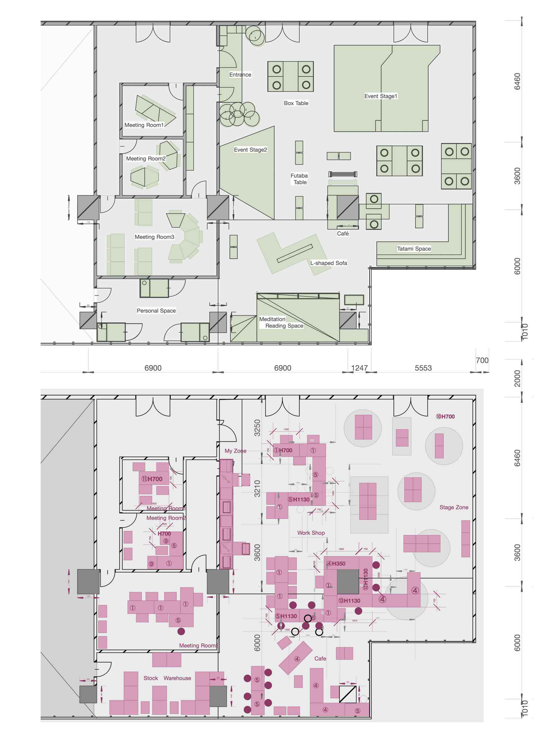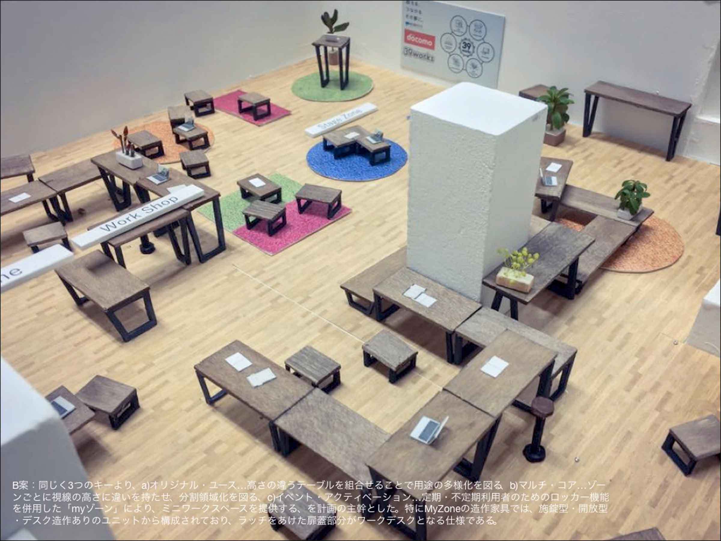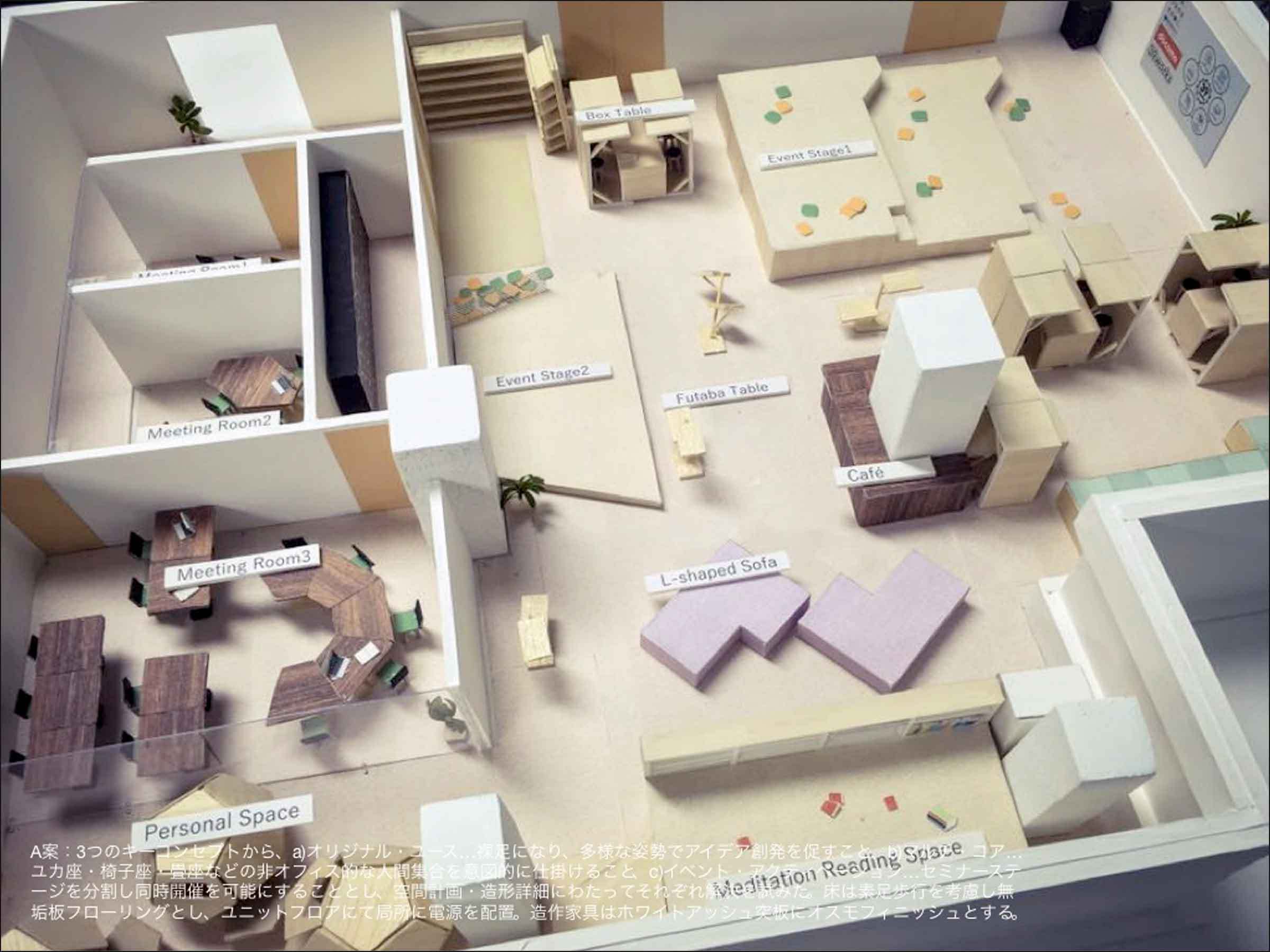A案は、3つのキーコンセプトをそれぞれ、a)オリジナル・ユース…裸足になり多様な姿勢でアイデア創発を促す、b)マルチ・コア…ユカ座・椅子座・畳座などの非オフィス的な人間集合を意図的に仕掛ける、c)イベント・アクティベーション…セミナーステージを分割し同時開催を可能にする、と解釈しデザイン案に込めた。またB案は、a)オリジナル・ユース…高さの違うテーブルを組合せることで用途の多様化を図る、b)マルチ・コア…ゾーンごとに視線の高さに違いを持たせ、分割領域化を図る、c)イベント・アクティベーション…定期・不定期利用者のためのロッカー機能を併用した「myゾーン」により、ミニワークスペースを提供する、を計画の主幹とした。