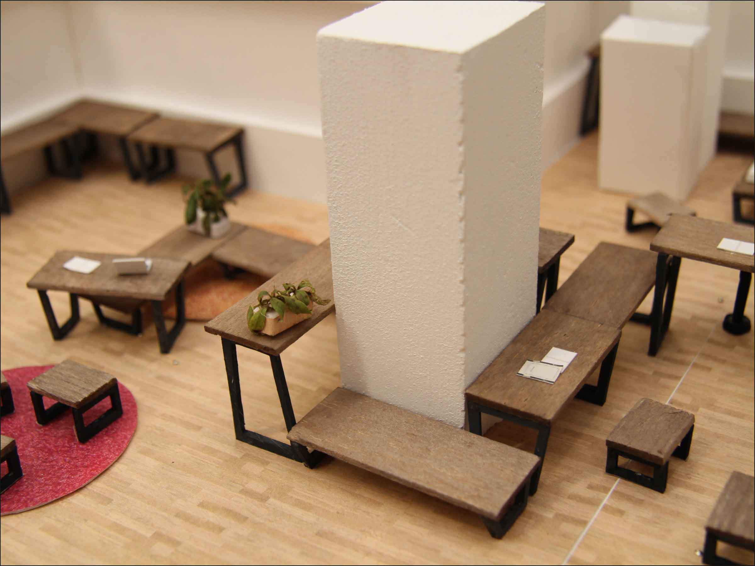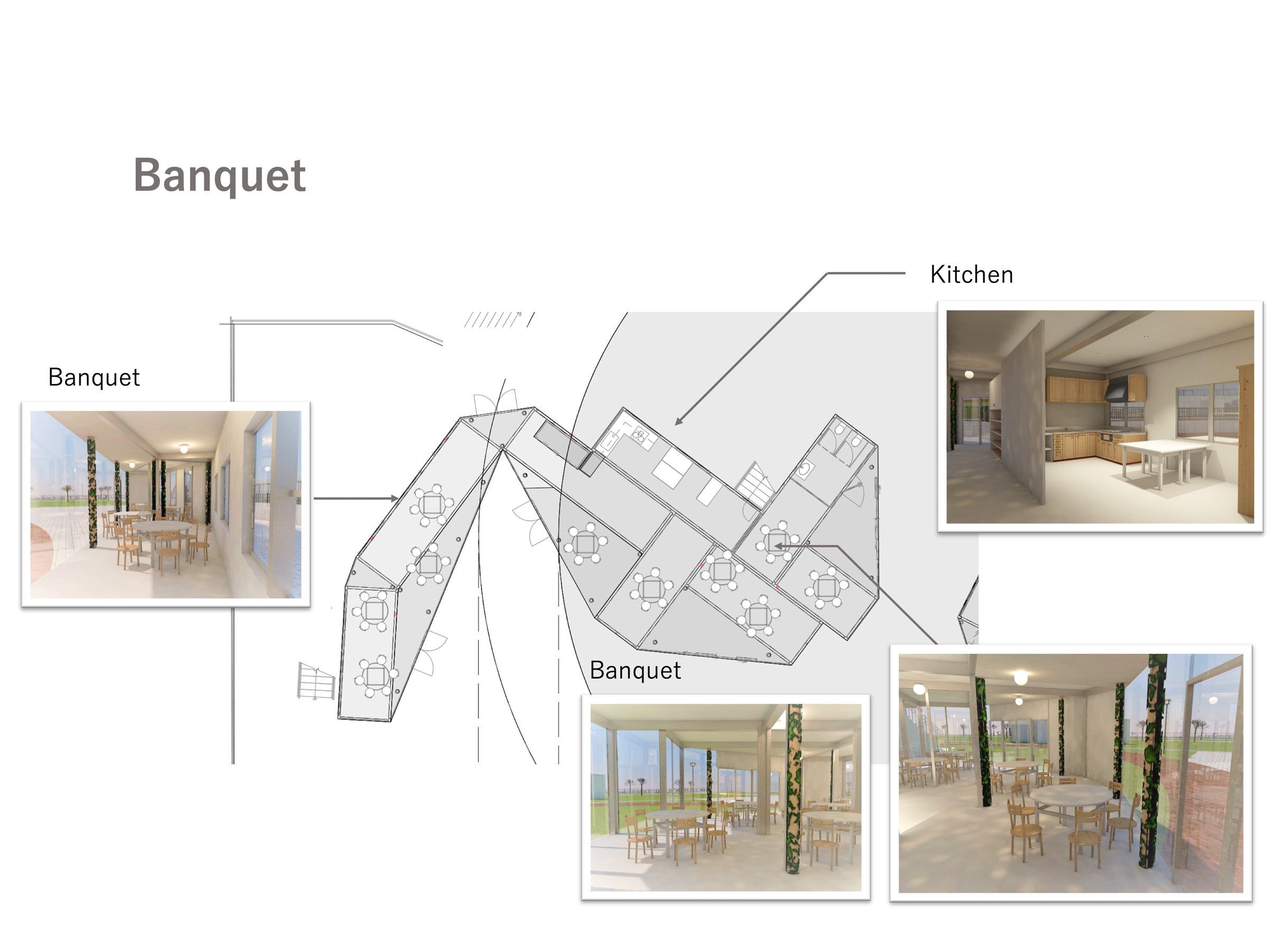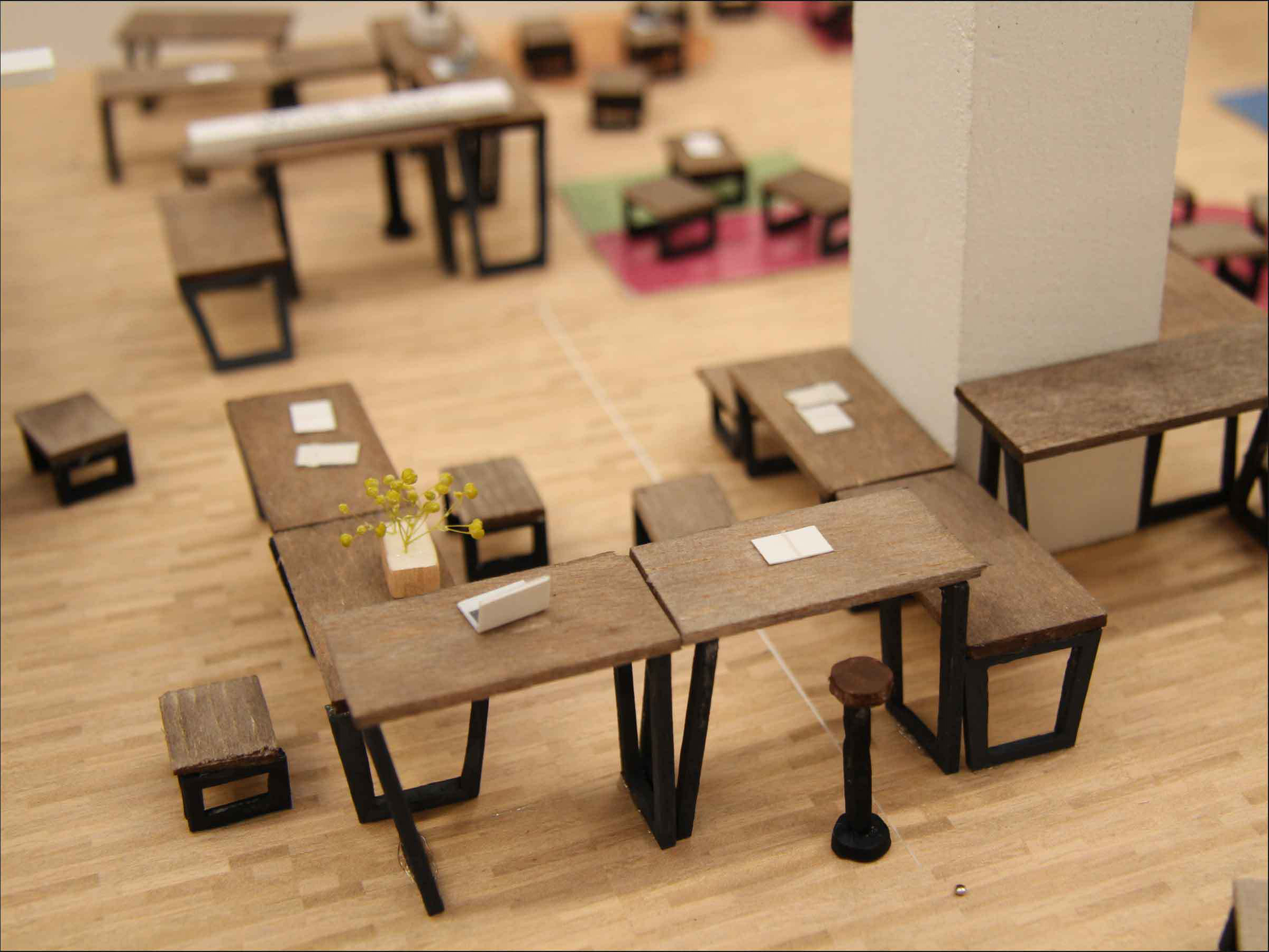 A案は、3つのキーコンセプトをそれぞれ、a)オリジナル・ユース…裸足になり多様な姿勢でアイデア創発を促す、b)マルチ・コア…ユカ座・椅子座・畳座などの非オフィス的な人間集合を意図的に仕掛ける、c)イベント・アクティベーション…セミナーステージを分割し同時開催を可能にする、と解釈しデザイン案に込めた。またB案は、a)オリジナル・ユース…高さの違うテーブルを組合せることで用途の多様化を図る、b)マルチ・コア…ゾーンごとに視線の高さに違いを持たせ、分割領域化を図る、c)イベント・アクティベーション…定期・不定期利用者のためのロッカー機能を併用した「myゾーン」により、ミニワークスペースを提供する、を計画の主幹とした。