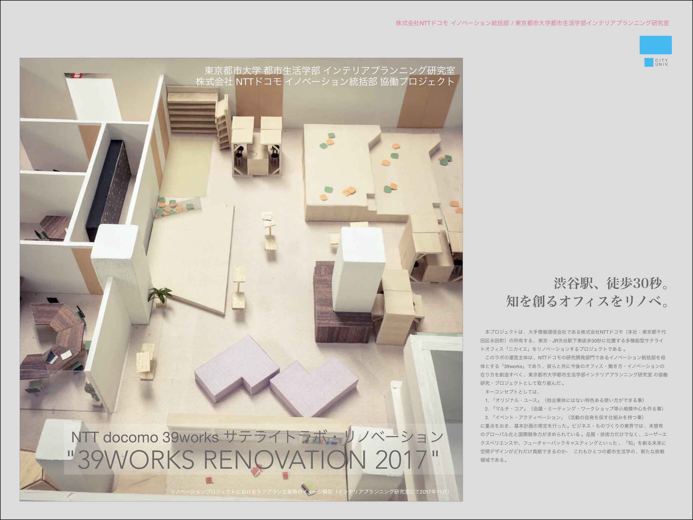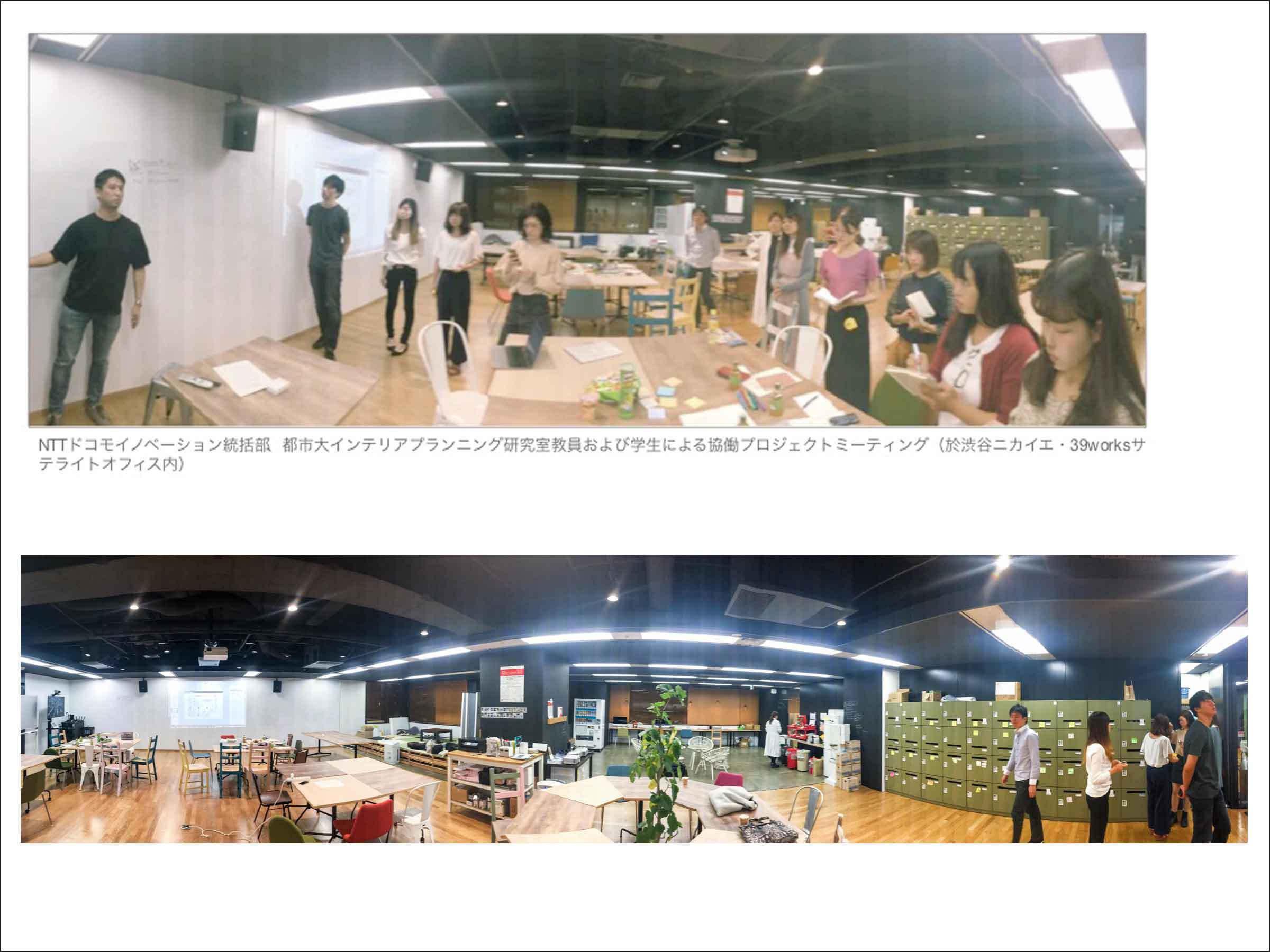 本プロジェクトは、大手情報通信会社である株式会社NTTドコモ(本社:東京都千代田区永田町)の所有する、東京・JR渋谷駅下車徒歩30秒に位置する多機能型サテライトオフィス「ニカイエ」をリノベーション提案する協働プロジェクトである。このラボの運営主体は、NTTドコモの研究開発部門であるイノベーション統括部を母体とする「39works」であり、彼らと共に今後のオフィス・働き方・イノベーションの在り方を創造すべく、東京都市大学都市生活学部インテリアプランニング研究室の協働研究・プロジェクトとして取り組んだ。